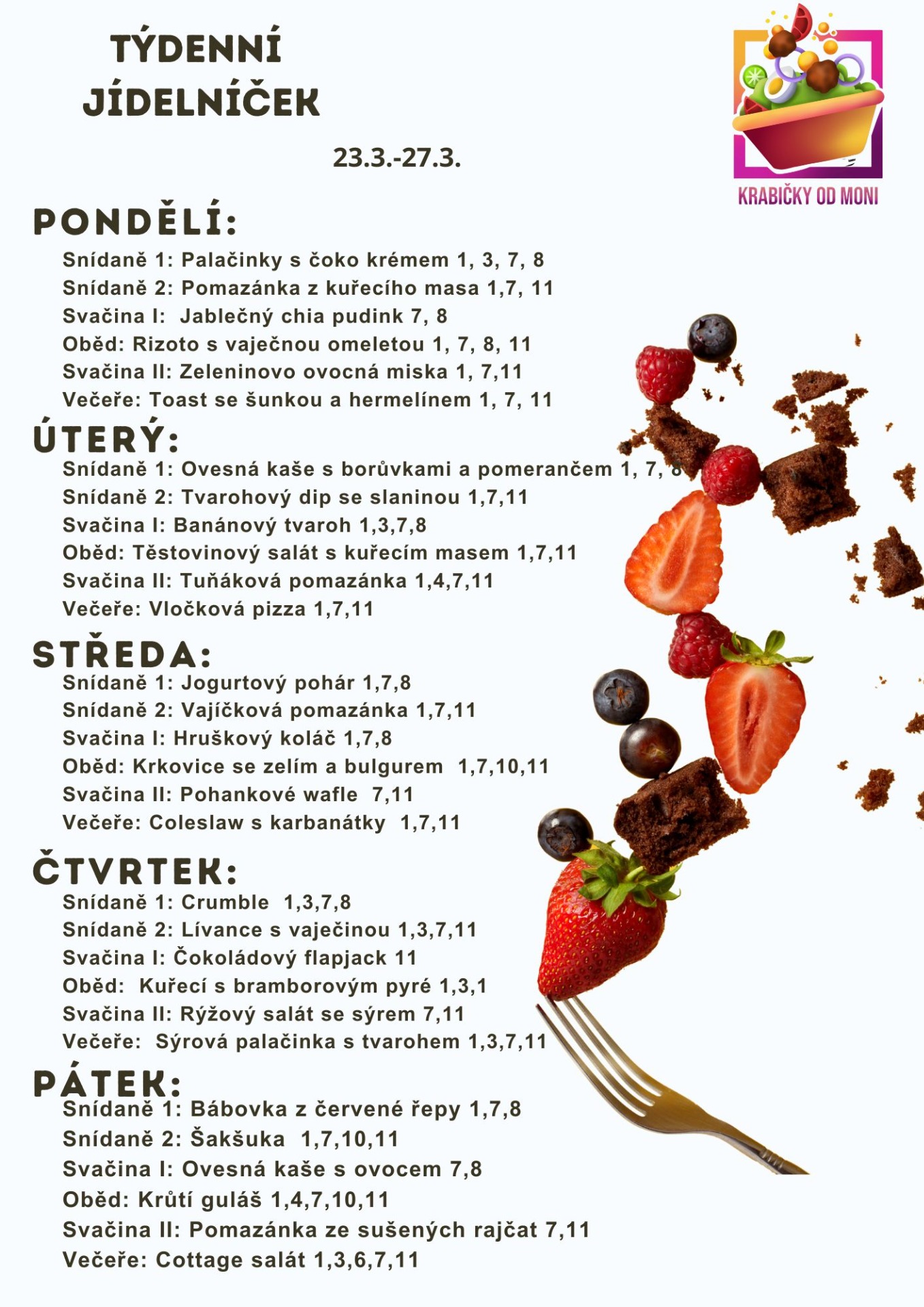 V nabídce máte na výběr zda, chcete sladkou nebo slanou snídani. Pak je menu fixní a nelze ho kombinovat. Pokud trpíte na nějakou alergii, vždy vše hlaste dopředu, je možné, že vám v mém menu nevyhovím. Jídla obsahují oříšky a jiné alergenní složky.